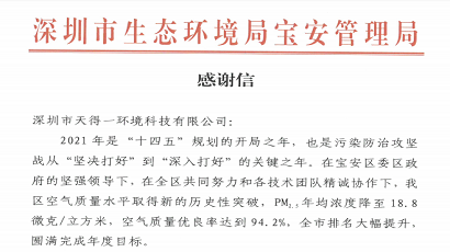 深圳市生态环境局宝安管理局给k8凯发(中国)天生赢家一触即发的感谢信