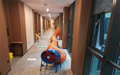4.整体换气。走廊鼓风机接上风管,让污染物排出建筑物,同时形成一定负压,让室外空气进入。
