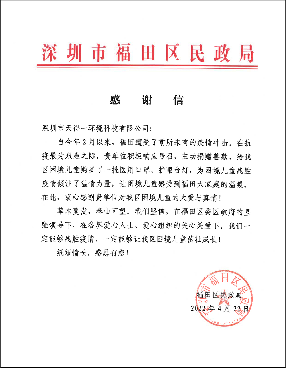 近日,k8凯发(中国)天生赢家一触即发收到了一封来自福田区民政局的感谢信,信中言辞真切,对k8凯发(中国)天生赢家一触即发在深圳抗疫期间的善举表示衷心的感谢。