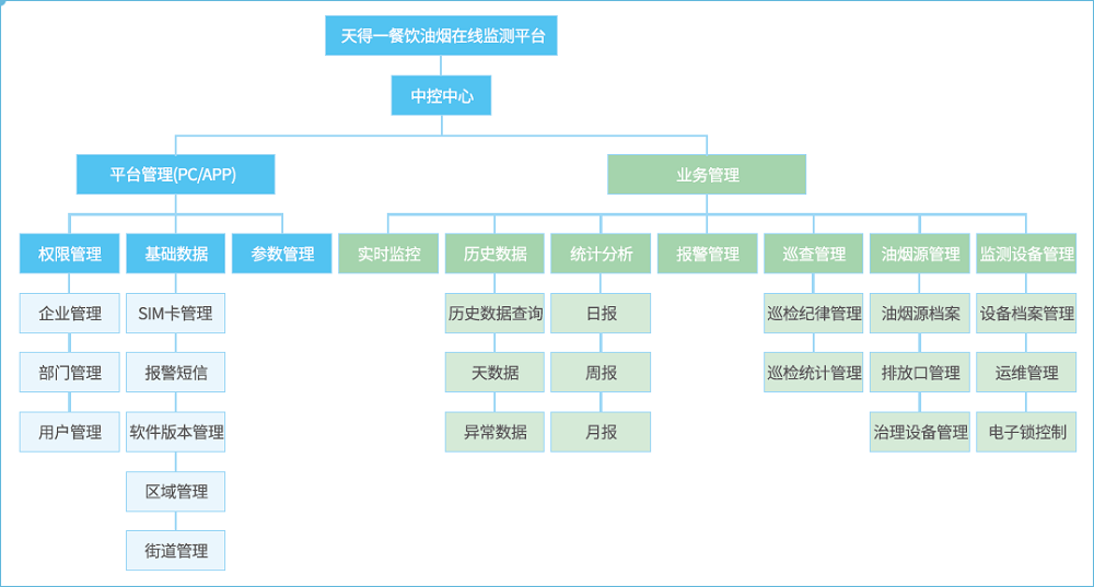 油烟在线监测管理系统平台是为满足环保行业特殊需求,利用物联网感知技术、GPRS无线通信技术等开发的一套高性能的集油烟监测、数据采集、数据传输为一体的系统。可对餐饮企业油烟排放浓度、净化器运行状态、风机运行状态等指标进行在线监控,可对油烟区域在线监控进行整体的数据管理、基础信息管理、当测数据展示及统计分析,从而将油烟治理设施工况数据与油烟浓度数据统一起来,为环保局提供直接有效且真实的油烟排放状况的专用油烟监测设备。