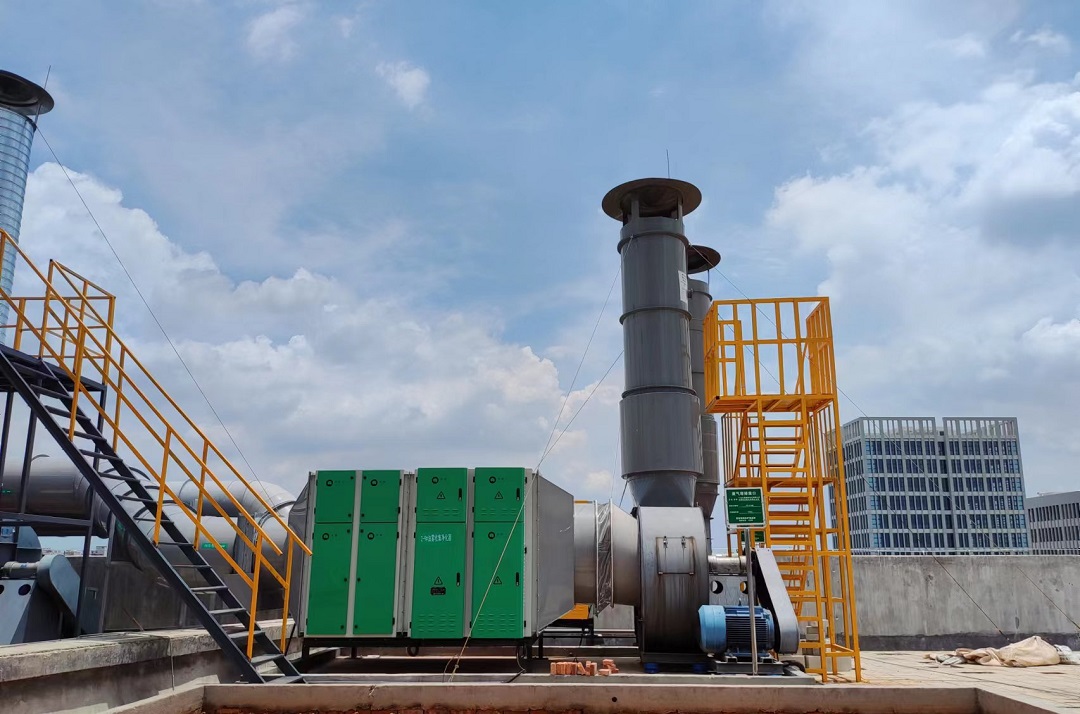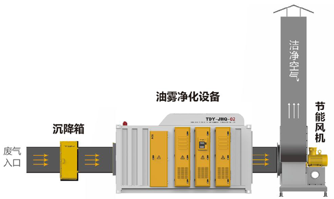 通过收集管道将四轴CNC产生的油雾颗粒物废气输送至“集成式智能油雾净化器”,将颗粒物进行吸附去除,然后通过“离心风机”将达标气体排入大气中。