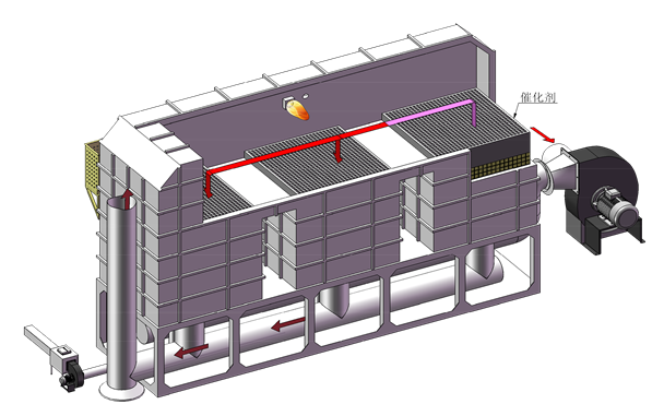 第一步是催化剂对VOC分子的吸附,提高了反应物的浓度,第二步是催化氧化阶段降低反应的活化能,提高了反应速率。借助催化剂可使有机废气在较低的起燃温度下,发生无氧燃烧,分解成CO2和H2O放出大量的热,与直接燃烧相比,具有起燃温度低,能耗小的特点,某些情况下达到起燃温度后无需外界供热,反应温度在250-400℃。