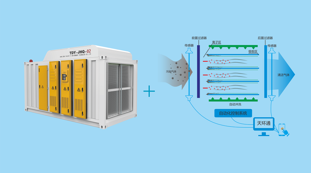 静电吸附技术:荷电: 在放电极与集尘极之间施加高电压, 生成空间电荷。含有污染物气流通过碰撞或者扩散使污染物分子荷电;吸附: 荷电后污染物大分子和小颗粒物在电场中受到库仑力的作用, 驱使污染物分子向集尘极运动, 最后沉积在集尘极表面;清洗: 集尘极表面上的油污沉积到一定的厚度后, 采用高压水枪对集尘极进行表面清洗, 清洗后再吹干重新工作。主要作用: 除去大分子高沸点有机物和细小颗粒物。