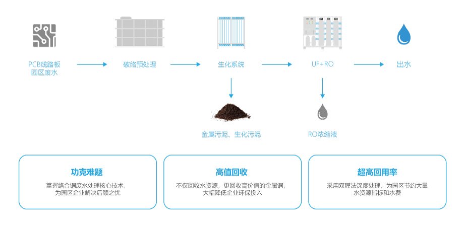 线路板(PCB)园区废水来自蚀刻、电镀、显影、退膜等多个复杂工序,其主要危害在于含有高浓度的铜离子,以及使其难以去除的络合剂(如EDTA),同时伴有高COD、高氨氮,络合铜废水毒性大,且常规化学沉淀法无效,是行业内公认的顶级处理难题。我司采用“分类收集、破络除铜、深度回用”的先进路线,将络合铜废水单独收集,采用高级氧化/化学破络技术打破其稳定结构,再进行高效沉淀除铜;其余废水经分类处理后,与生活污水一并进入MBR生化系统。最终产物为可直接回用于生产线的高纯度回用水(RO水)、高价值的铜污泥和生化污泥,确保稳定达到《电镀污染物排放标准》(GB 21900-2008)中针对线路板行业的表3标准,回用水质达到生产工艺要求。