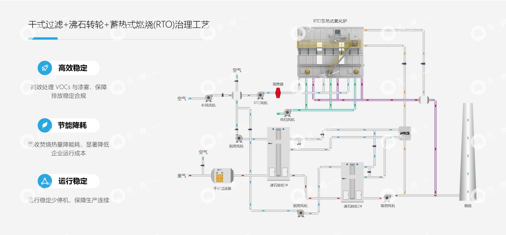 我司针对上述痛点采取 “漆雾预处理 —VOCs 深度销毁” 的科学治理路径,推出干式过滤器+沸石转轮+RTO一体化解决方案:前端高效干式过滤拦截漆雾,转轮浓缩后接蓄热式焚烧炉高温分解 VOCs 为无害物质,回收热量降能耗,整体系统兼顾耐腐与高效,适配复杂工况,助力行业绿色升级。