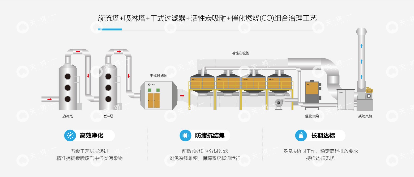 针对此类废气,我司采用“旋流塔+喷淋塔+干式过滤器+活性炭吸附+催化燃烧 ”的五级协同净化工艺,废气首先经旋流塔实现漆雾的高效初级去除,继而进入喷淋塔完成深度净化与精准降温,循环水由排污泵定量送废水站,不堵管、不积渣。随后,干式过滤器负责拦截残余微尘与水汽,为后端核心设备提供保护。系统的核心在于吸附-再生闭环:VOCs组分被活性炭富集净化,达标气体直接排放,高浓度脱附气则在催化燃烧炉(CO)中被彻底分解为CO₂与H₂O,反应余热回用于炭床再生,最终实现废气治理的长期稳定与能源循环。