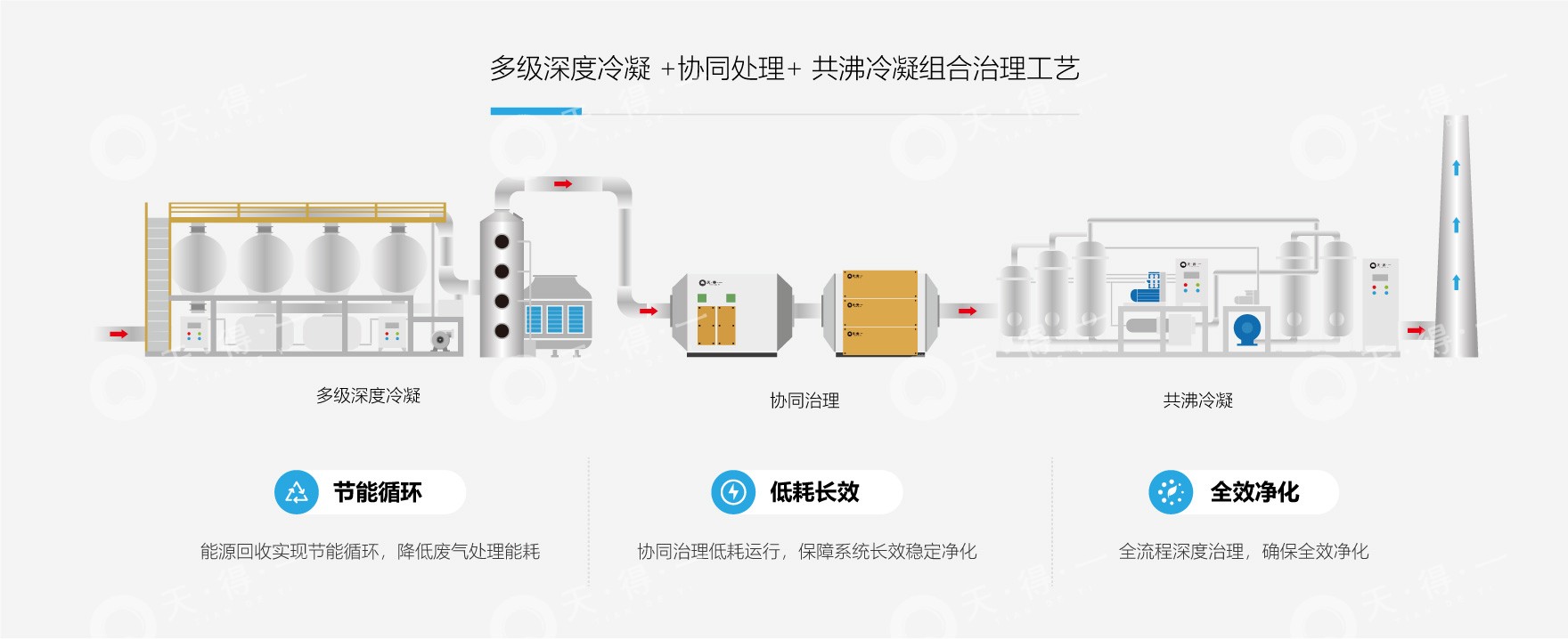 针对储罐呼吸气浓度波动大、成分复杂的治理难点,我司采用 “多级深度冷凝 +协同处理+ 共沸冷凝”组合回收工艺。该系统首先通过深度冷凝阶段高效回收高沸点溶剂,协同处理阶段去除废气中的酸性成分,随后,不凝气体进入共沸冷凝单元深度处理,系统整体回收效率高达98%以上,实现剩余有机组分的高效回收与废气深度净化。该工艺具备处理效率高、适应性强、运行稳定等优势,同时通过协同处理解决氟化氢气体腐蚀运行系统的痛点问题,在确保废气达标排放的同时,实现有机溶剂资源化回收,兼具环境效益与经济效益。