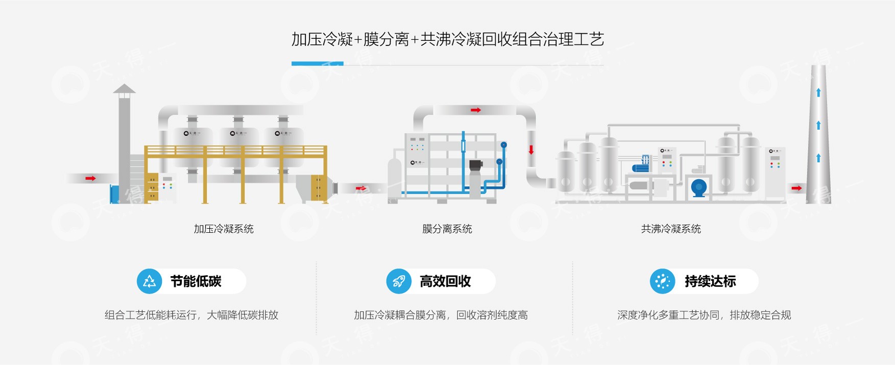 针对湿法制膜废气的治理,我司采用自主研发的“加压冷凝+膜分离+共沸冷凝回收”组合工艺,二氯甲烷回收效率最高可达99%。该工艺流程主要是先对废气进行加压冷凝,直接回收其中高浓度的二氯甲烷,随后废气进入膜分离单元,浓缩的高浓度气流,返回加压冷凝单元再次回收。低浓度废气则进入下一共沸冷凝回收模块,通过高效吸附捕集、脱附与多级梯度冷凝的联合作业,实现残余有机物的深度回收与净化。本工艺在确保高浓度废气经深度净化后稳定达标排放的同时,实现了有价资源的高效回收,兼顾了环境效益与经济效益,能有效解决高浓度、可回用废气治理的难题。