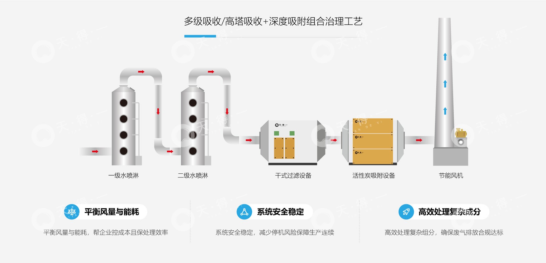 针对NMP废气水溶性强、浓度波动大的特点,我司采用 “多级吸收/高塔吸收+深度吸附”组合工艺。废气首先进入多级吸收塔或高塔吸收塔,利用NMP的水溶性进行梯度吸收,高浓度循环液可回收NMP,实现资源回用,回收效率高达90%以上,剩余废气再经深度吸附单元进一步净化,确保系统稳定达标排放。该工艺在实现废气高效净化的同时,兼顾溶剂回收与运行经济性。